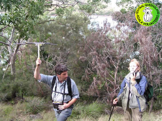 While Garry uses the radio tracking receiver to get a fix on a koala, Fiona radios the other tracking team to tell them where the koalas are